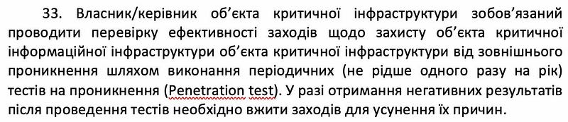 Тобто, пентести вимагаються. І знахідки треба буде усувати. А кого усувати, якщо все успішно навернеться під час такого пентесту? А знаєте що, в мене є здогад, що не навернеться. Бо робити ці “пентести” будуть експерти Держспецзв’язку, які їх робити не будуть. Завіса.